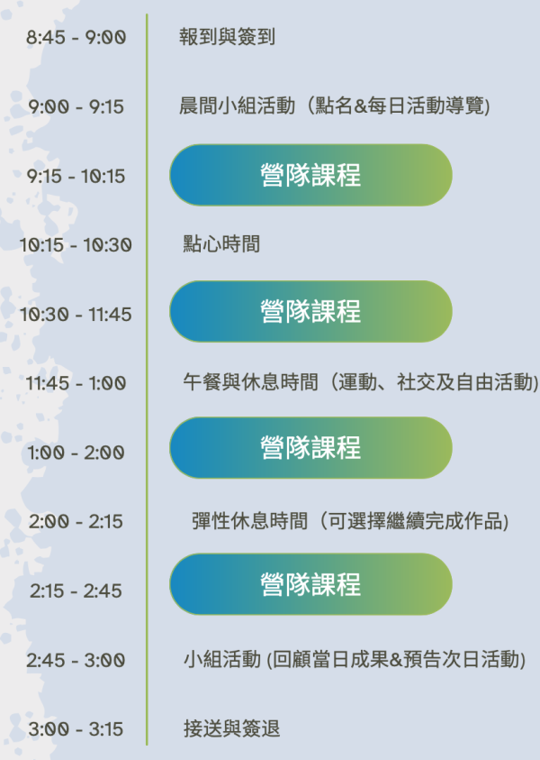-課程時間:週一至週五上午9:00-下午3:00